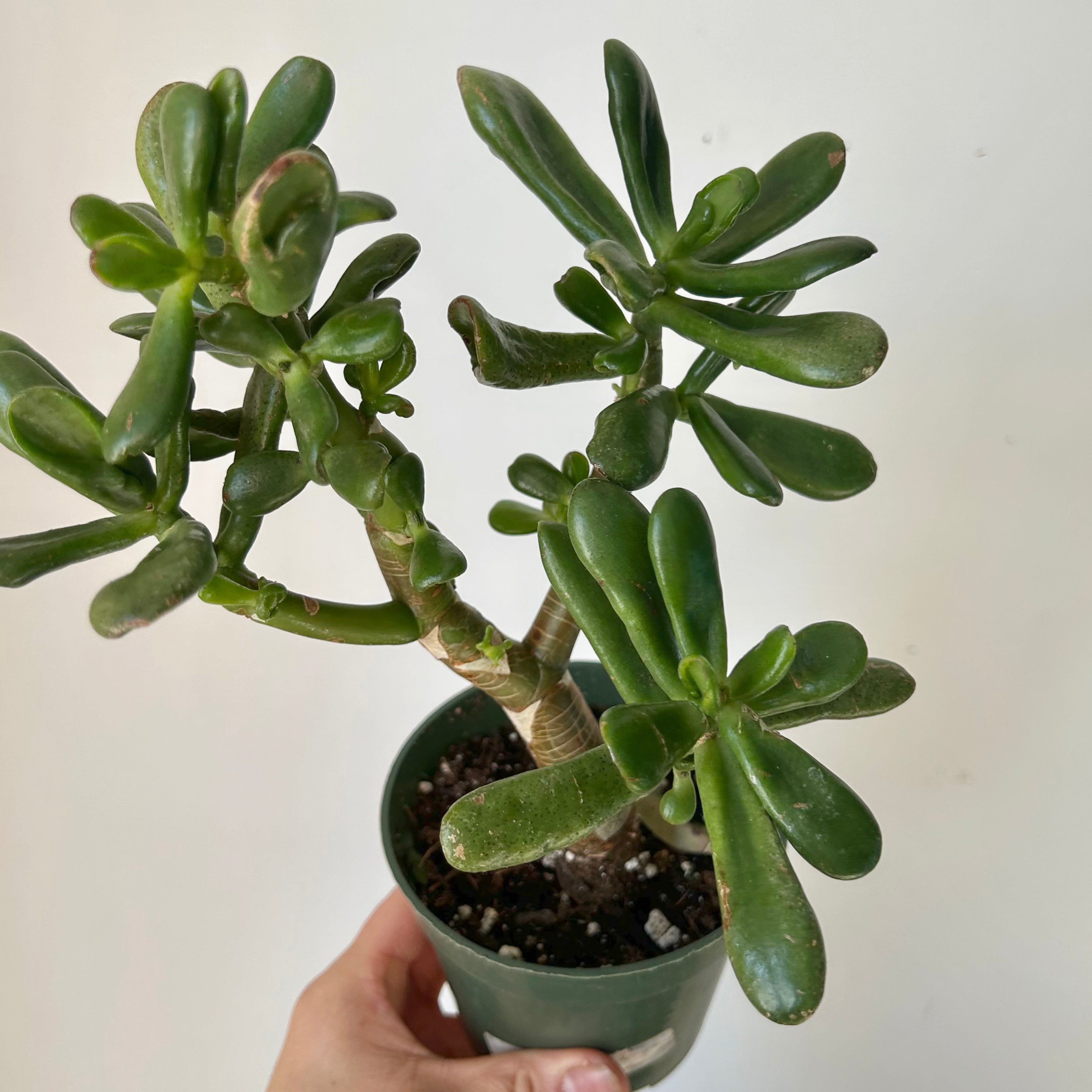 This Hobbit Jade is starting to cork and develop a "trunk" giving it a tree-like silhouette. This succulent thrives with minimal care. With time, it will continue to develop a thick, gnarled trunk, making it a stunning centrepiece.