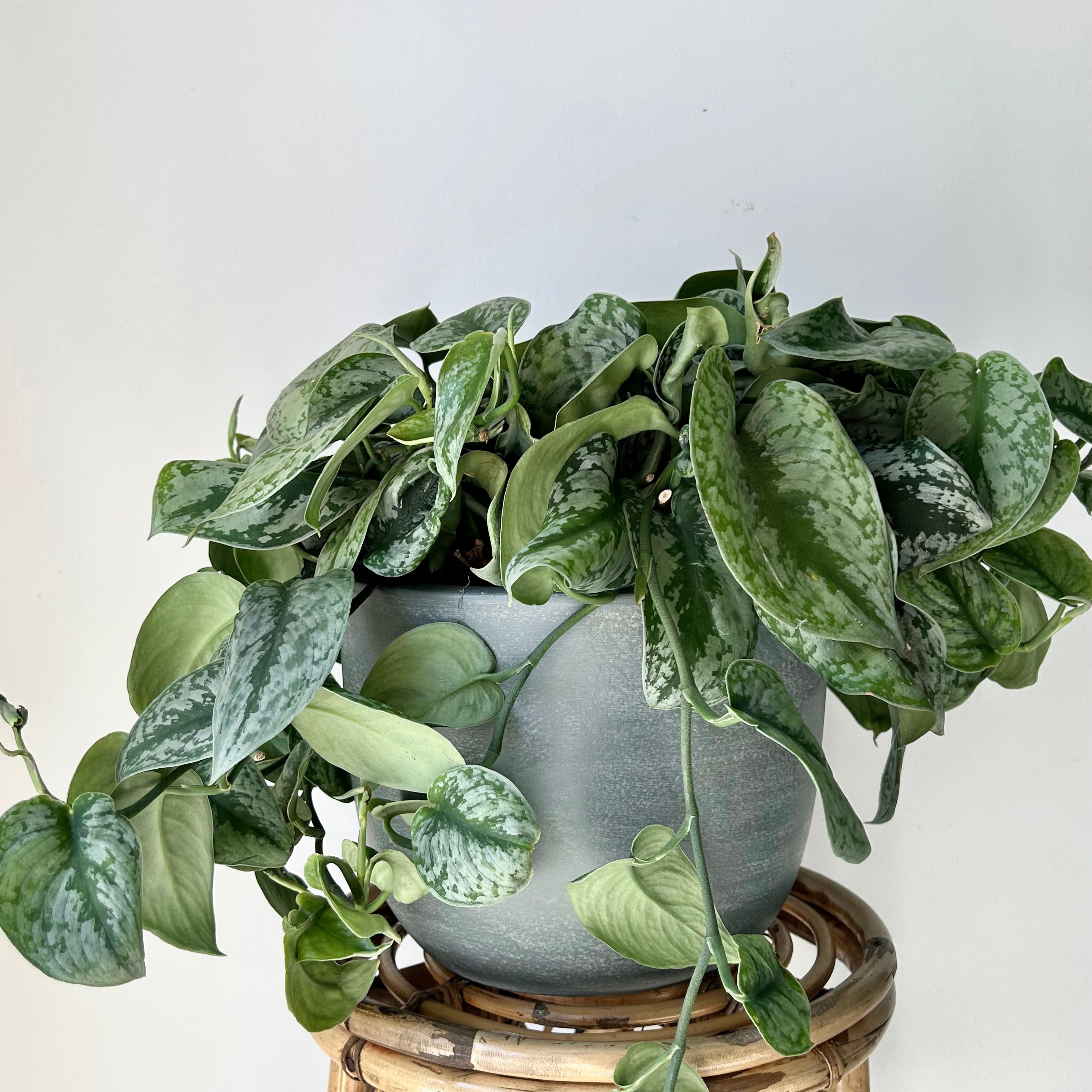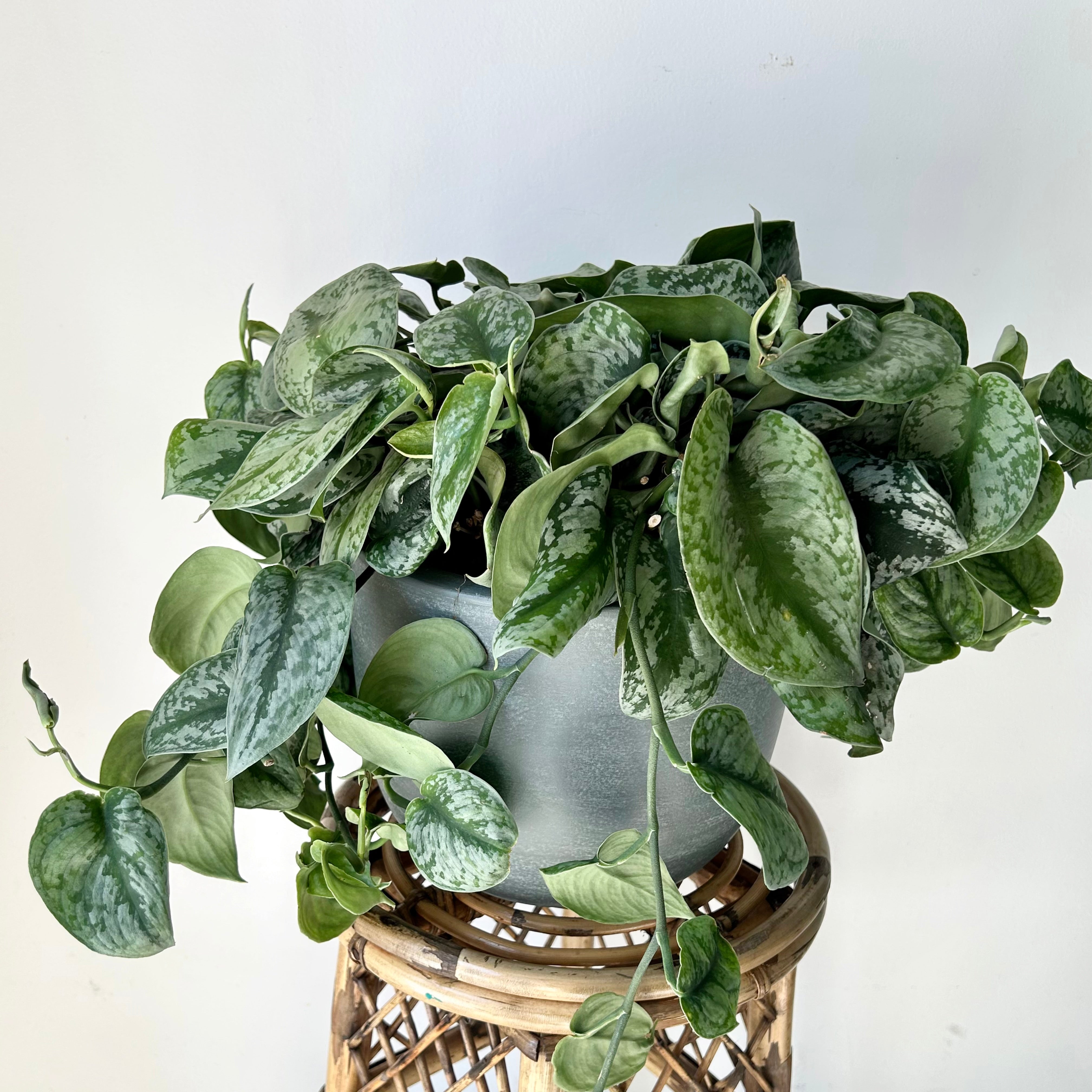 This Scindapsus boasts reflective variegation, which occurs when air pockets form between the lower and upper layers of the leaf. Light reflects off these transparent air pockets, giving the leaves a sparkle! The "Exotica" displays a high degree of silver variegation and an intricate pattern that can be likened to a delicate filigree.