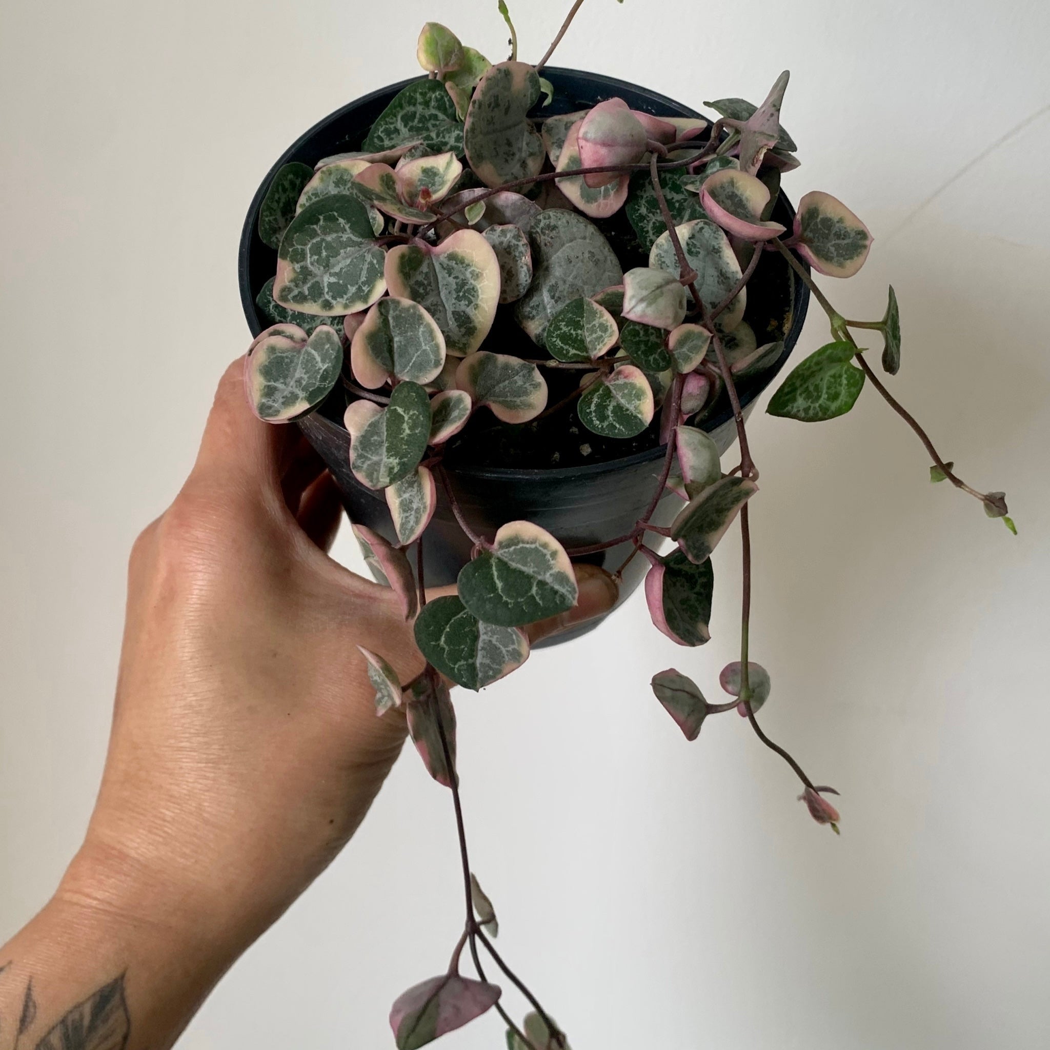 The Variegated String of Hearts is a trailing succulent vine featuring arrowhead-shaped leaves with beautiful cream, pink, and green variegation. This elegant plant is perfect for suspended planters draping over shelves, bringing a delicate, cascading look to indoor spaces.
