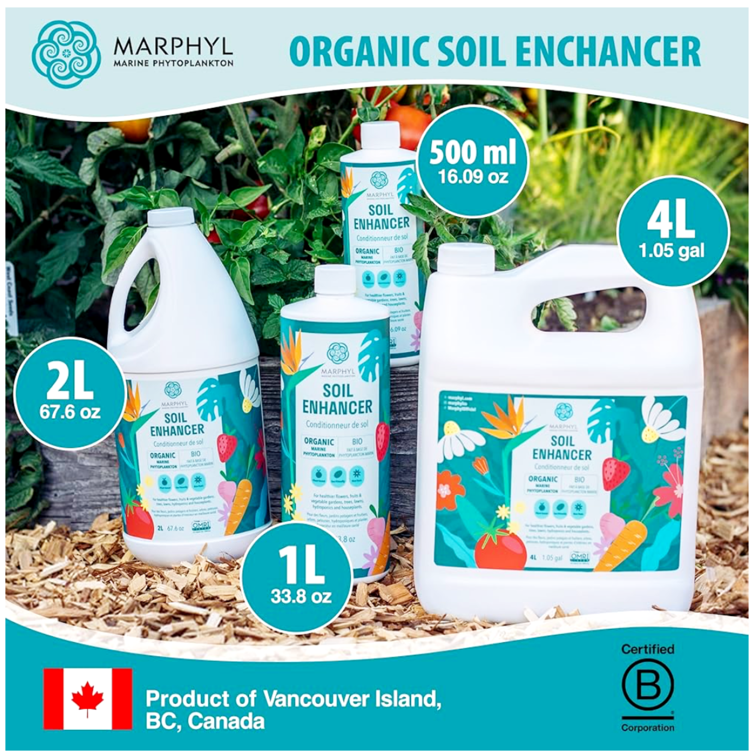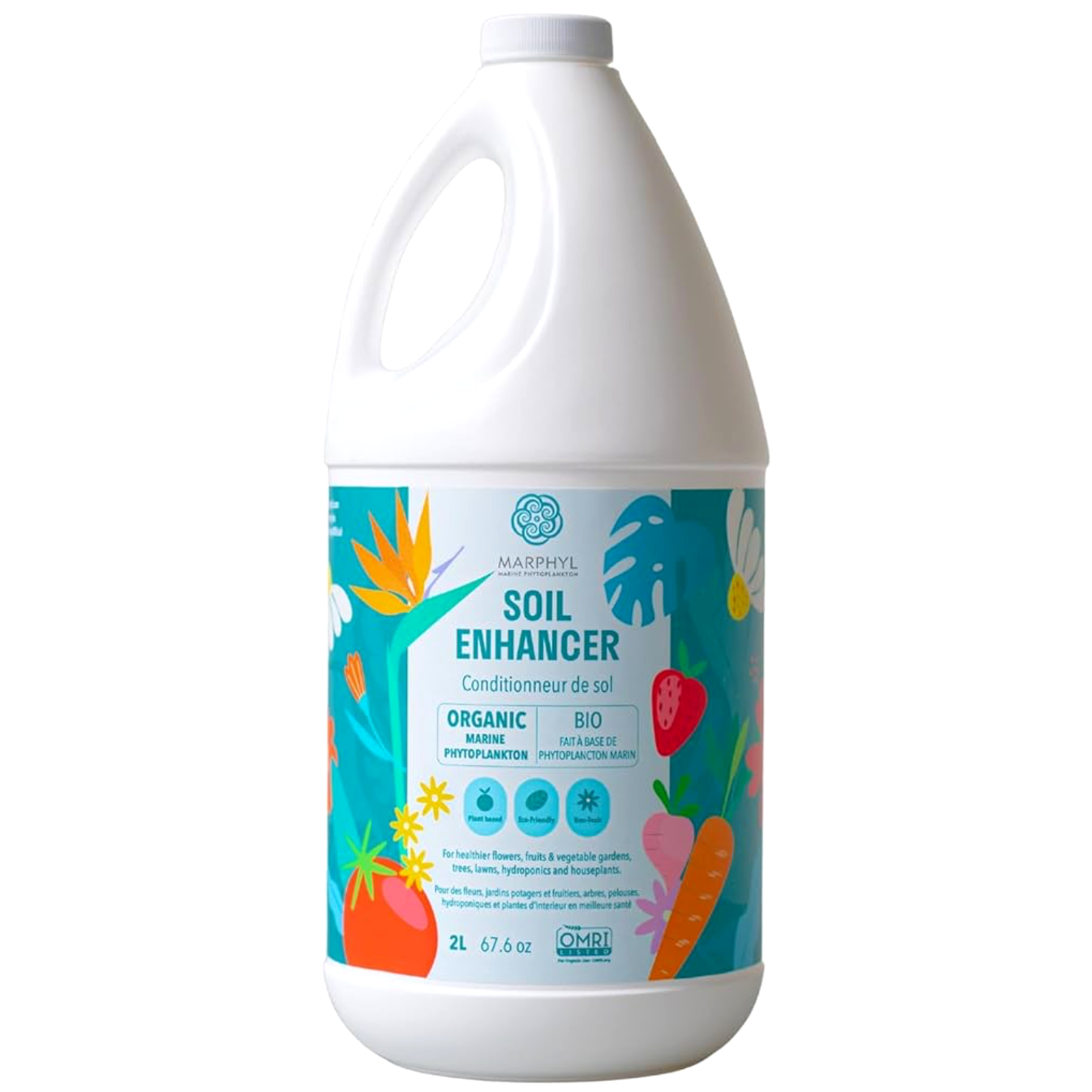 MARPHYL Soil Enhancer consists of up to 80 different species of wild marine phytoplankton and provides an array of essential nutrients for your plants. This natural liquid Soil Enhancer boosts plant health and replenishes the soil as plants grow. It is nutritionally dense in trace minerals, antioxidants, carotenoids, amino acids, chlorophyll, proteins and vitamins. MARPHYL Soil Enhancer can be used on indoor or outdoor plants, vegetables or flowers, lawns, and even hydroponics. OMRI is certified for organic use in Canada & USA.